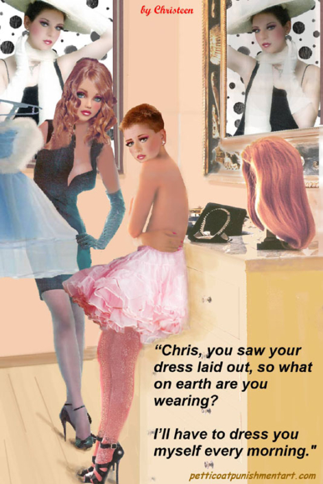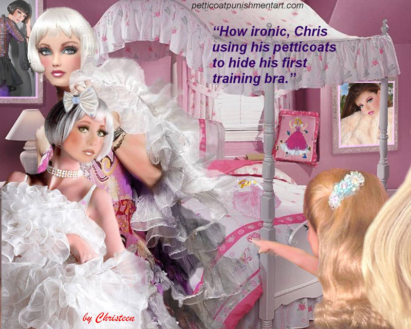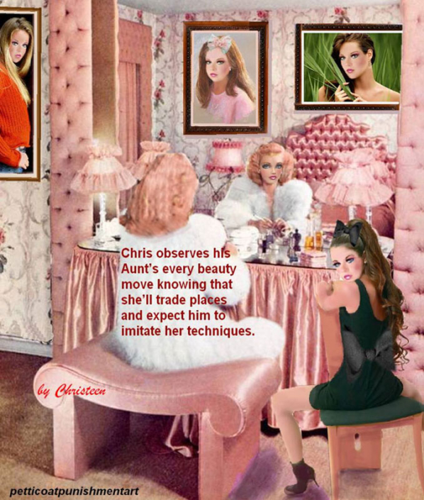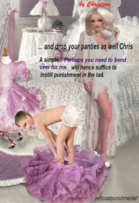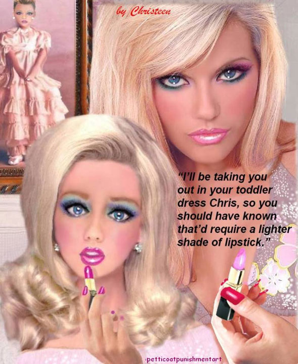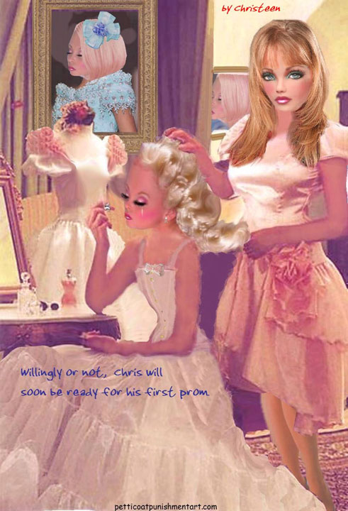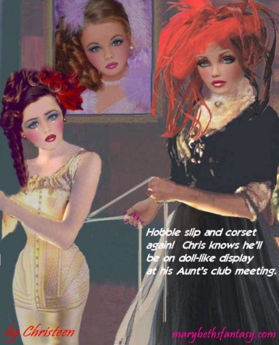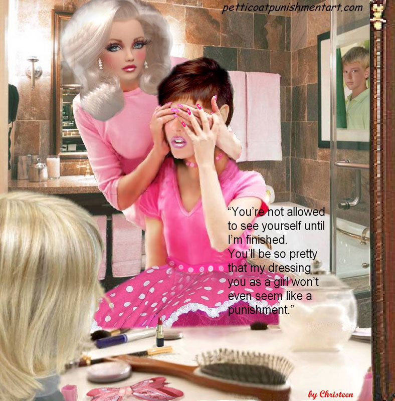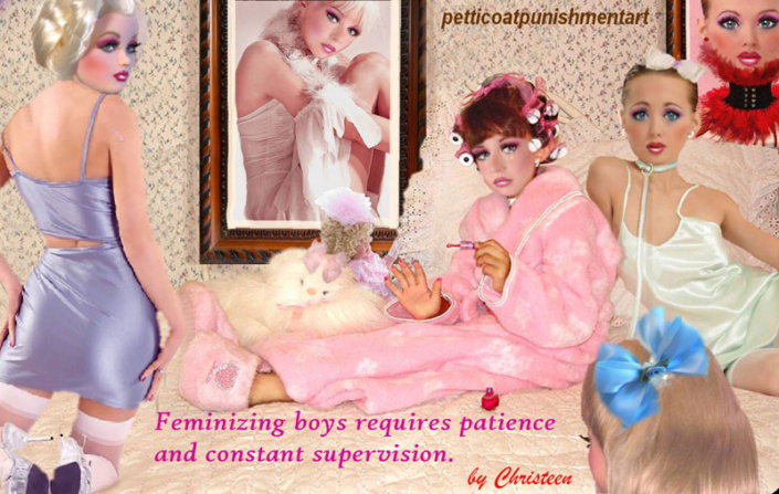 The premise of the story line of Christeen comics seems to be this: Chris is a little boy who lives with his rich, single mother and sometimes stays with his rich single aunt who both start sissifying, feminizing an transforming Chris into a girl at a very young age along with the help of a Sissy Transformation Academy called Mademoiselle and a group of rich ladies who love to transform their little boys into girls an make them into models and living dolls. They say its punishment for being a bad boy that they transform them into girls but it’s obvious it’s just because that is what these rich women enjoy.