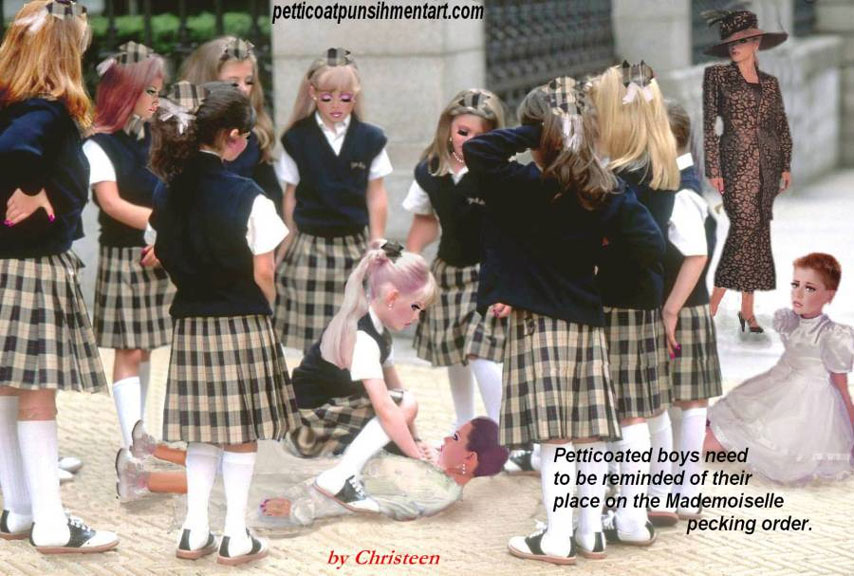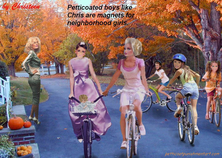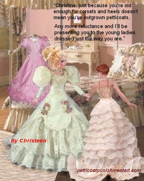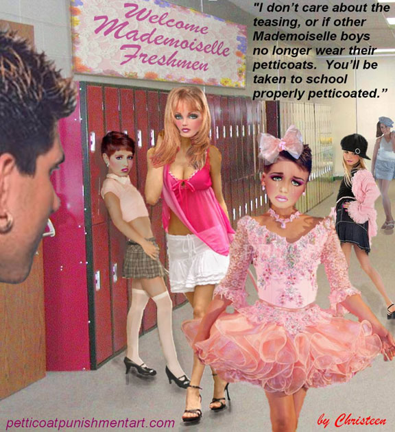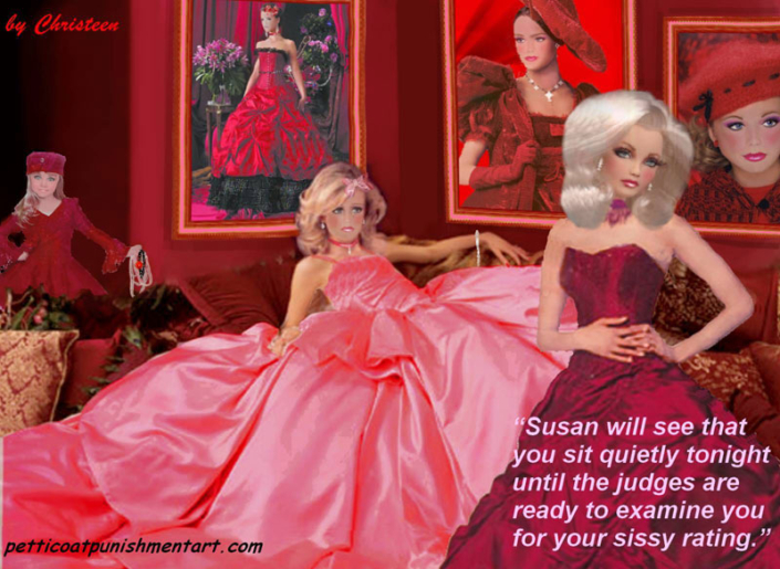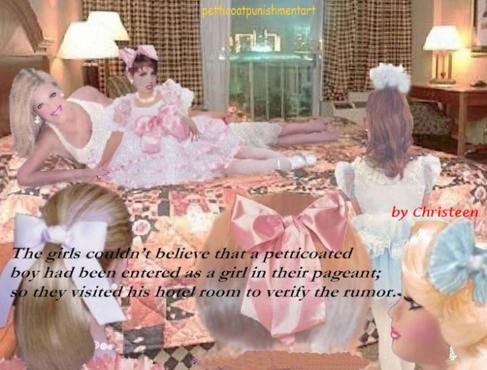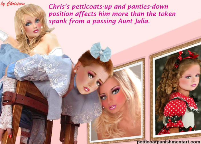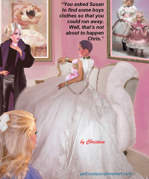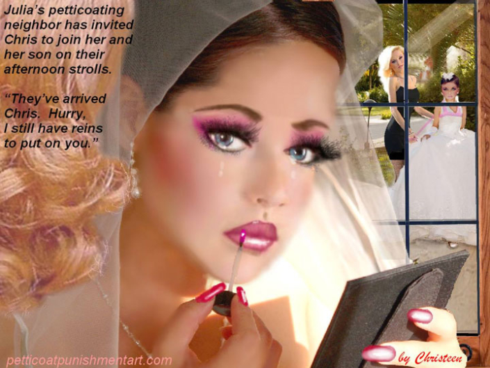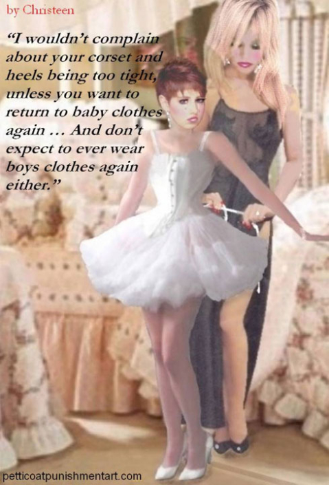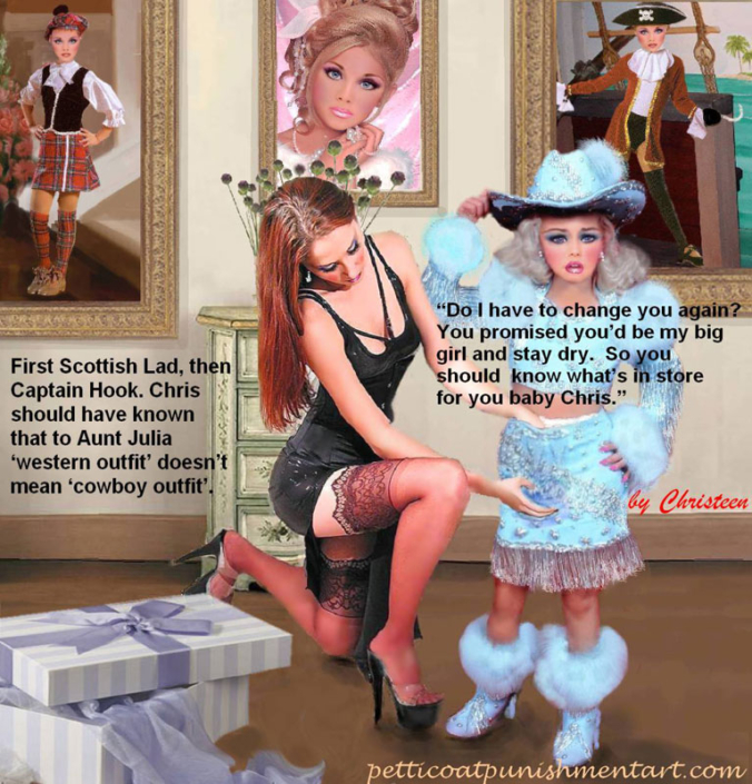 The premise of the story line of Christeen comics seems to be this: Chris is a little boy who lives with his rich, single mother and sometimes stays with his rich single aunt who both start sissifying, feminizing an transforming Chris into a girl at a very young age along with the help of a Sissy Transformation Academy called Mademoiselle and a group of rich ladies who love to transform their little boys into girls an make them into models and living dolls. They say its punishment for being a bad boy that they transform them into girls but it’s obvious it’s just because that is what these rich women enjoy.