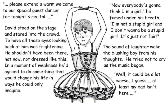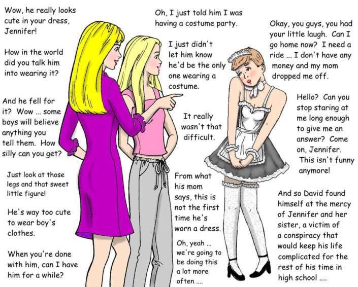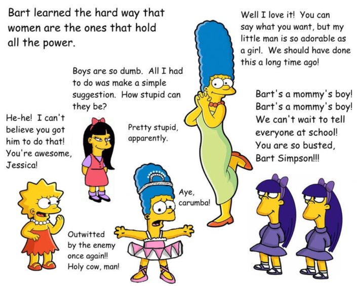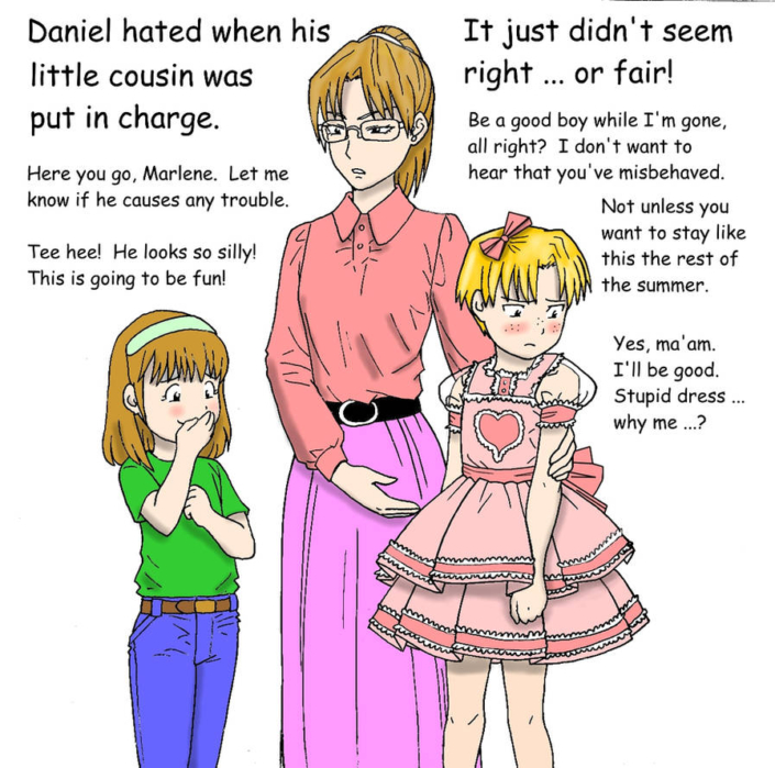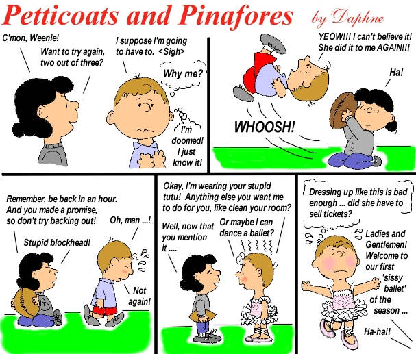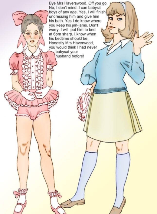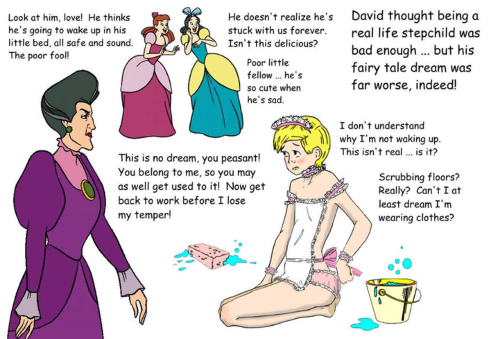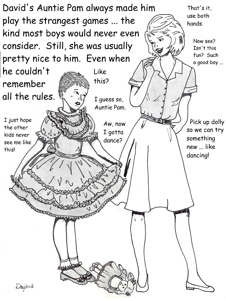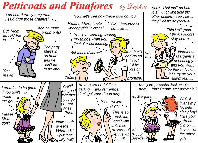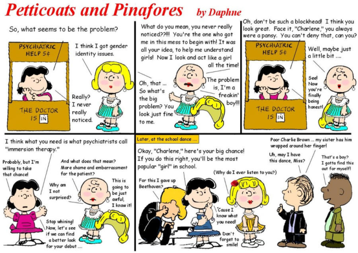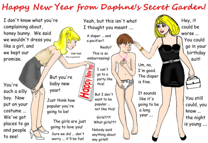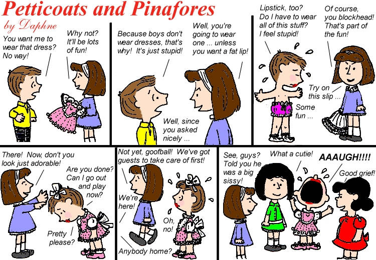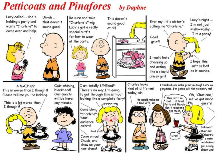 Daphne’s Secret Garden art is playful and fun and very much in the classic style of a young boy being strictly supervised into wearing sissy clothing. I found the Peanuts and Simpsons tributes to be just charming, and we all always knew that Lucy is a Dominant!