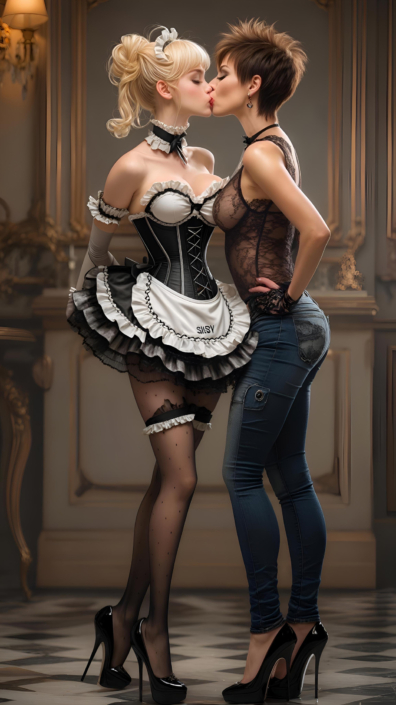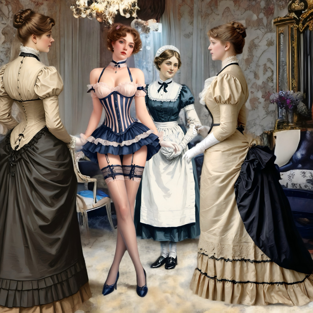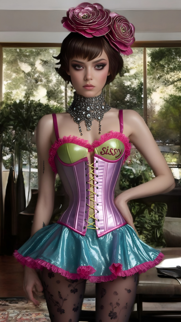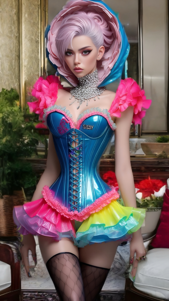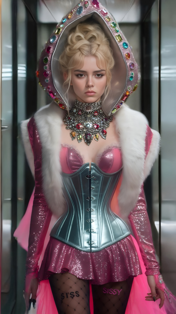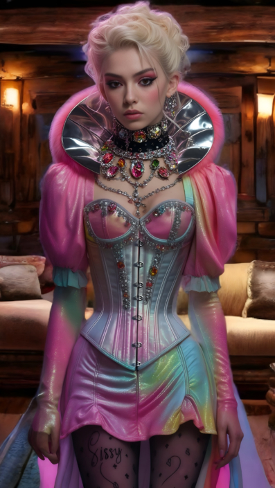 winner57’s AI artwork is a delightful dichotomy of classic corsets combined with all kinds of modernity. Future tech like milking & hypnotism machines and all mix of dark and Victorian looks, or super bright colors for exciting futuristic fabrics!